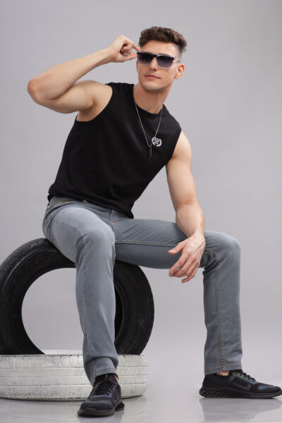 Men’s Washed Black Denim Pant with Leather Patch Finish