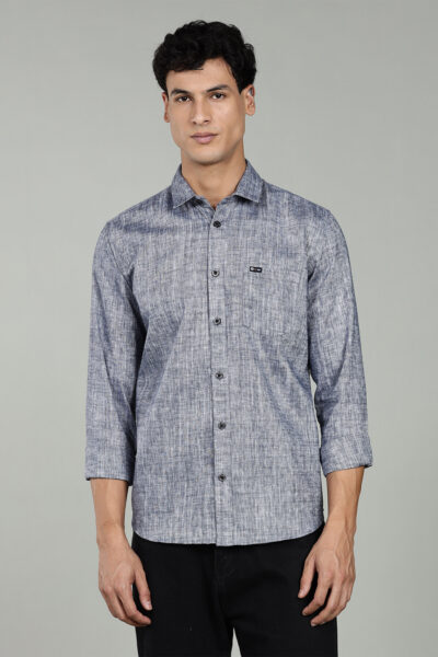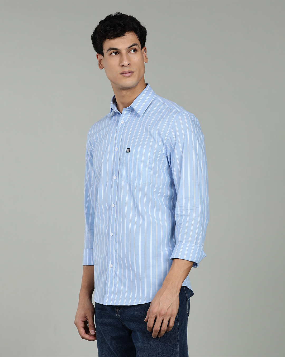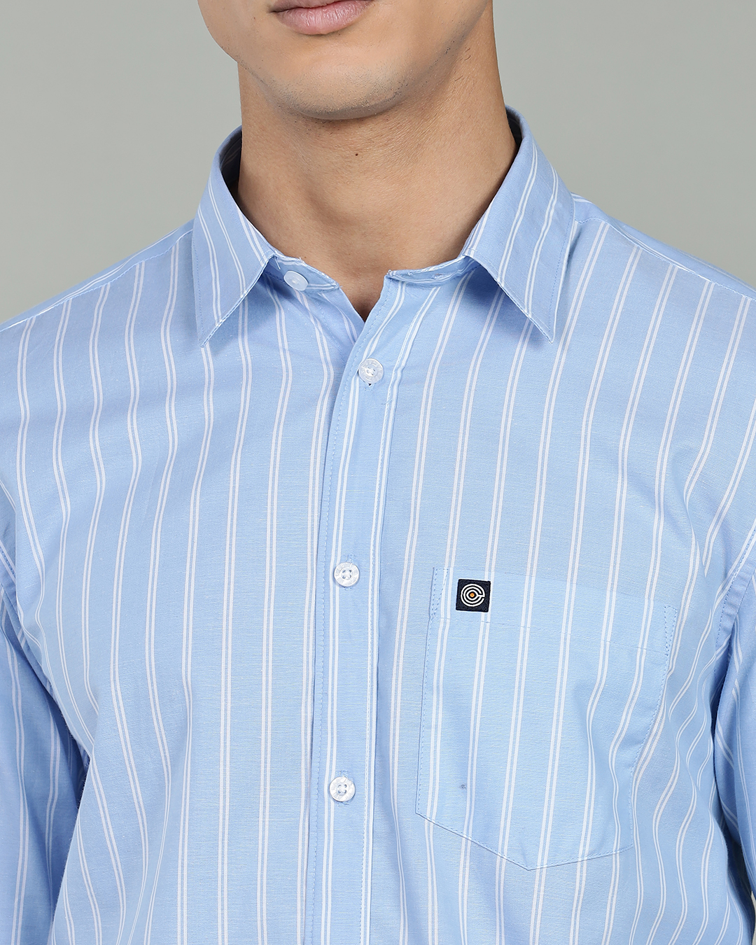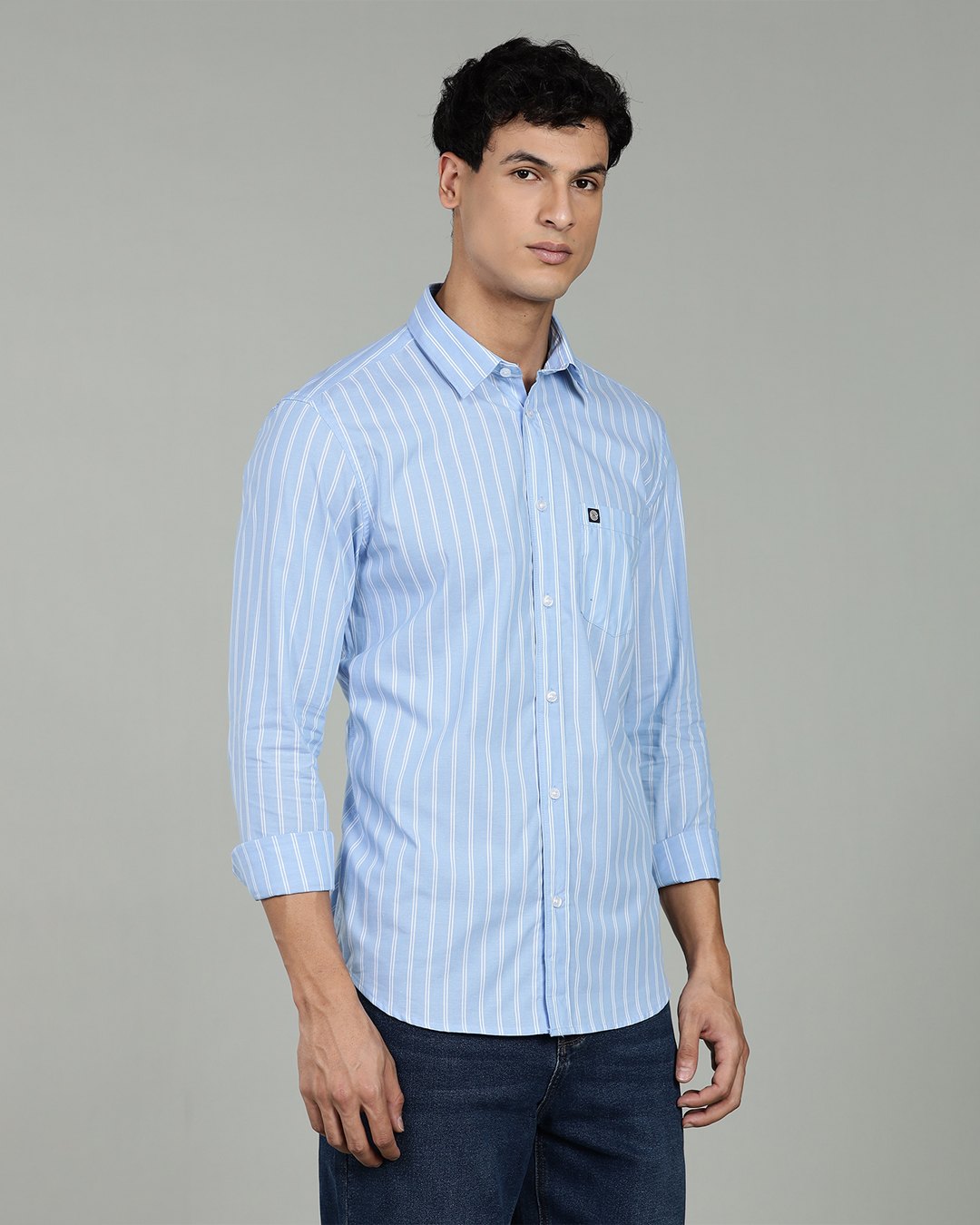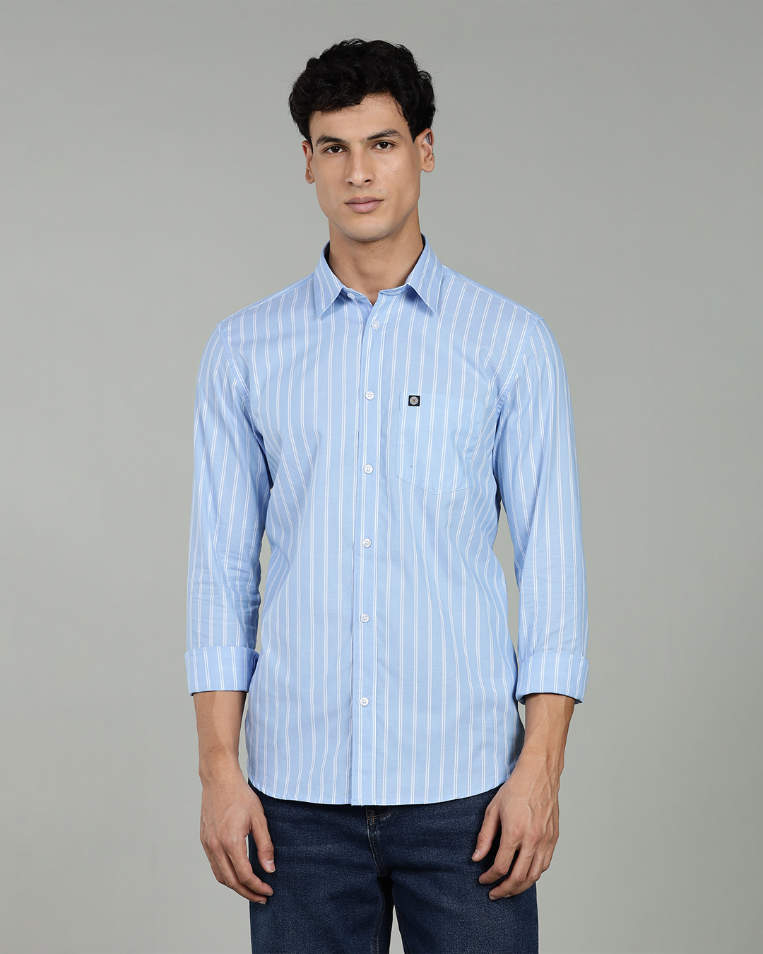 Men’s 100% Cotton Chambray Vertical Stripe Long Sleeve Shirt – Blue