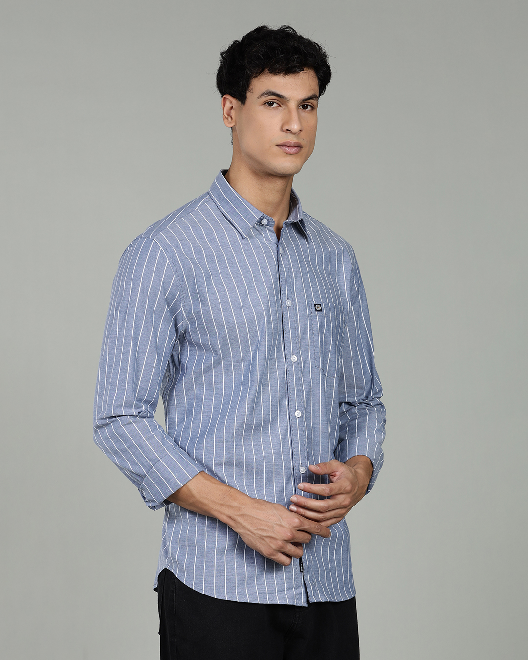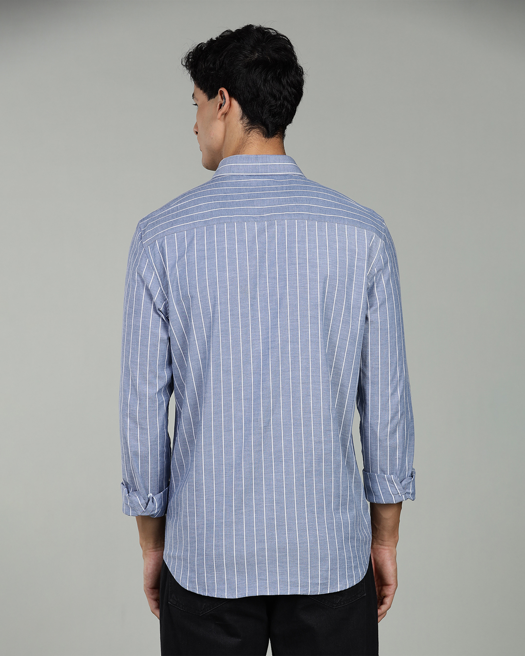 The navy blue striped pattern adds a refined modern touch, giving the shirt a sleek and versatile appearance suitable for work, semi-formals, and smart casual styling. ✧