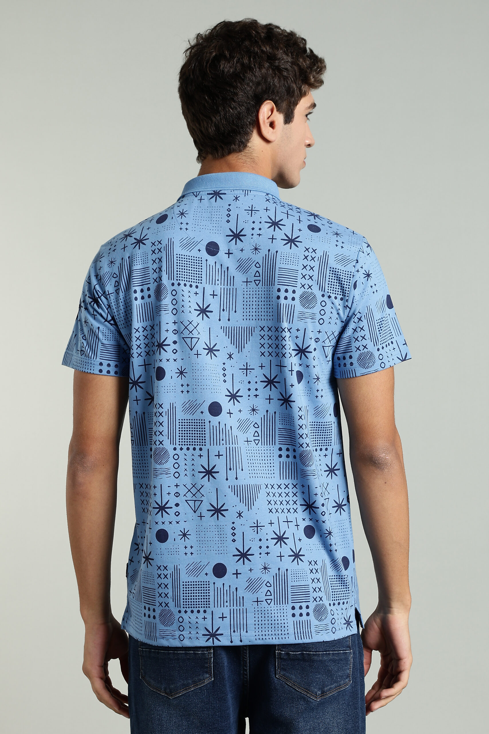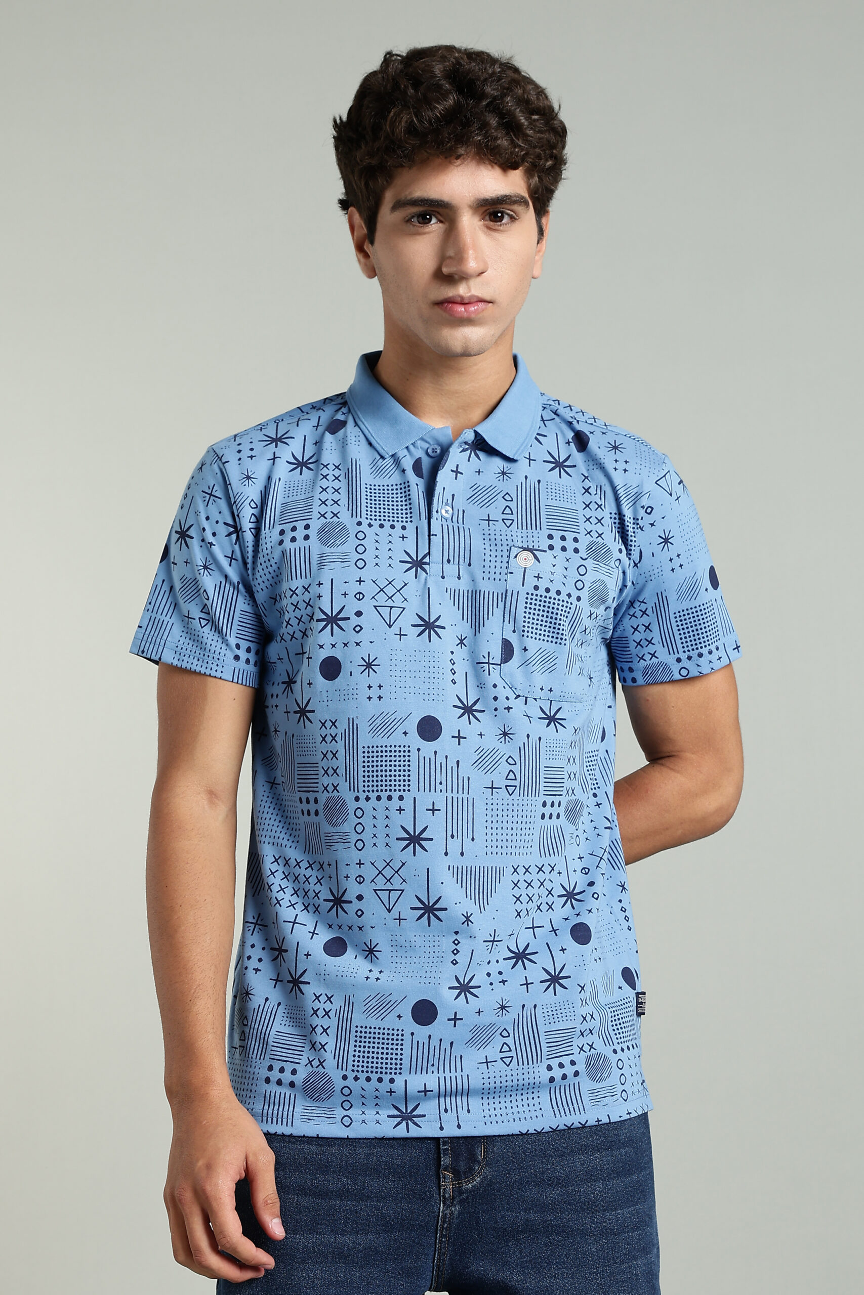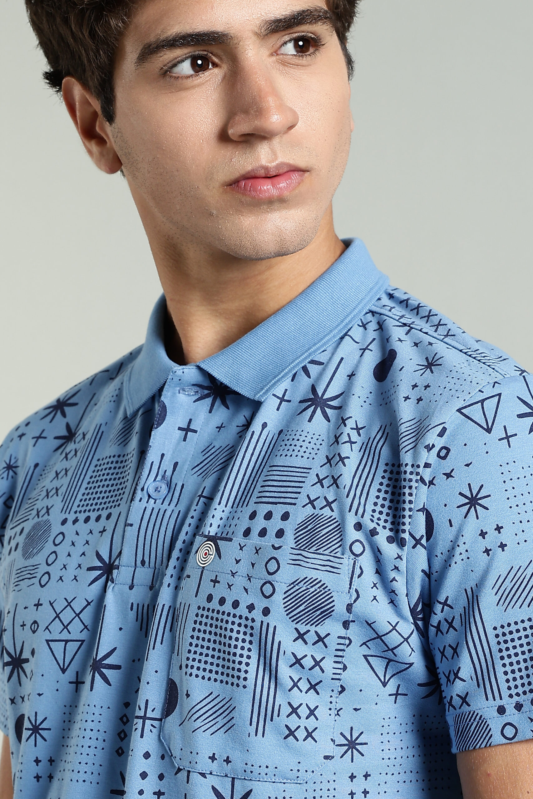 Men’s Cotton-Rich AOP Polo T-Shirt with Contrast HD Logo – White & Blue