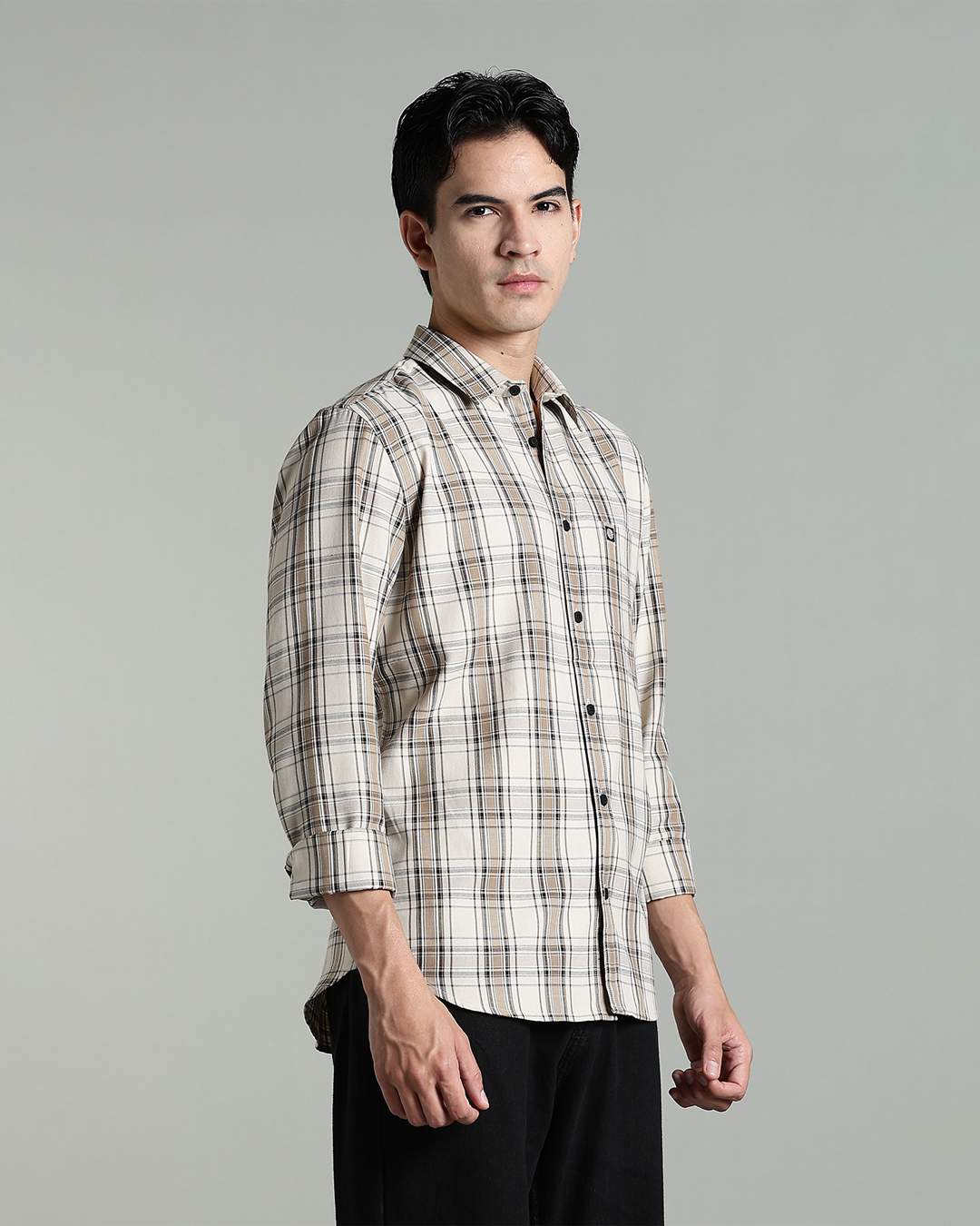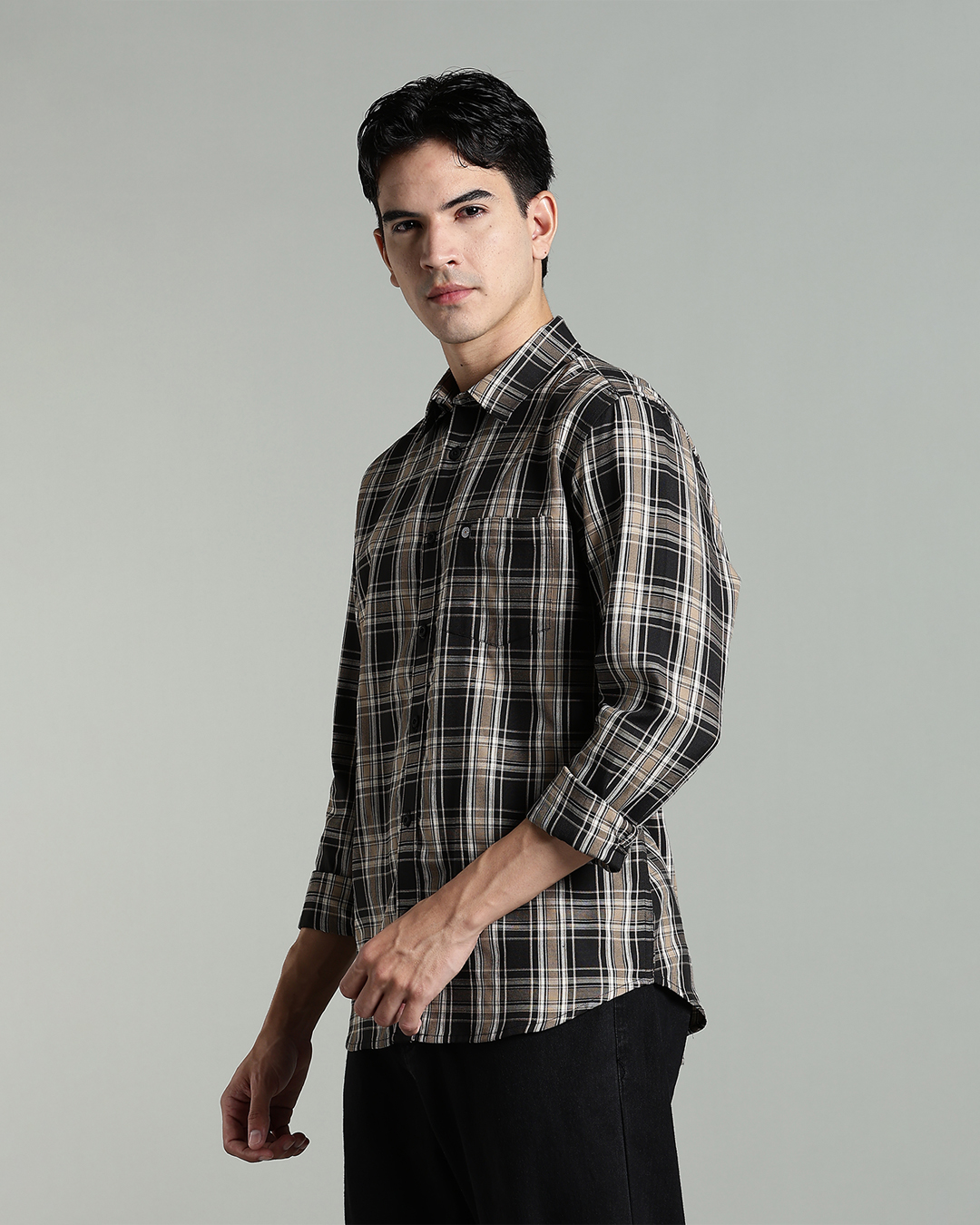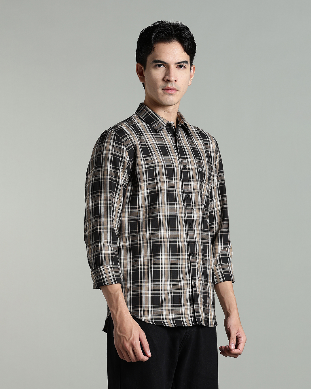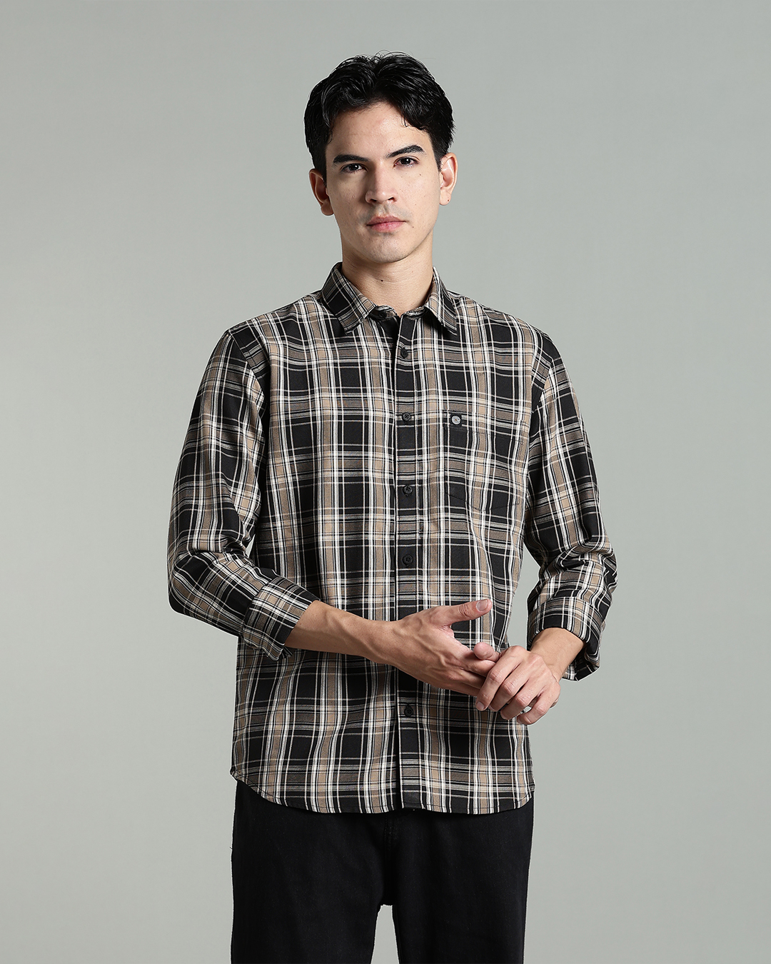 Men’s Cotton-Rich Checked Long Sleeve Shirt – Black & Beige