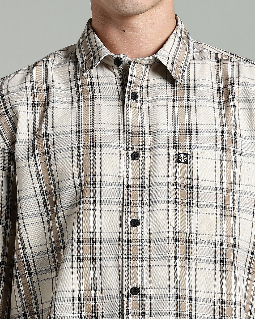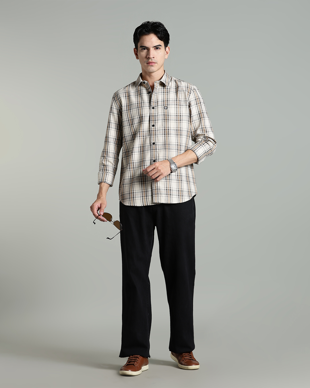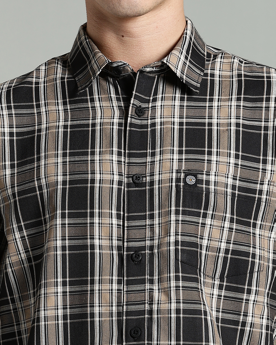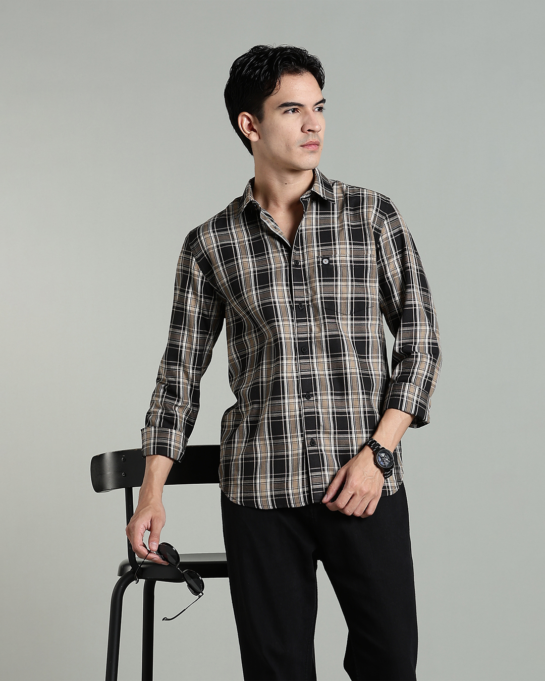 Men’s Cotton-Rich Checked Long Sleeve Shirt – Black & Beige