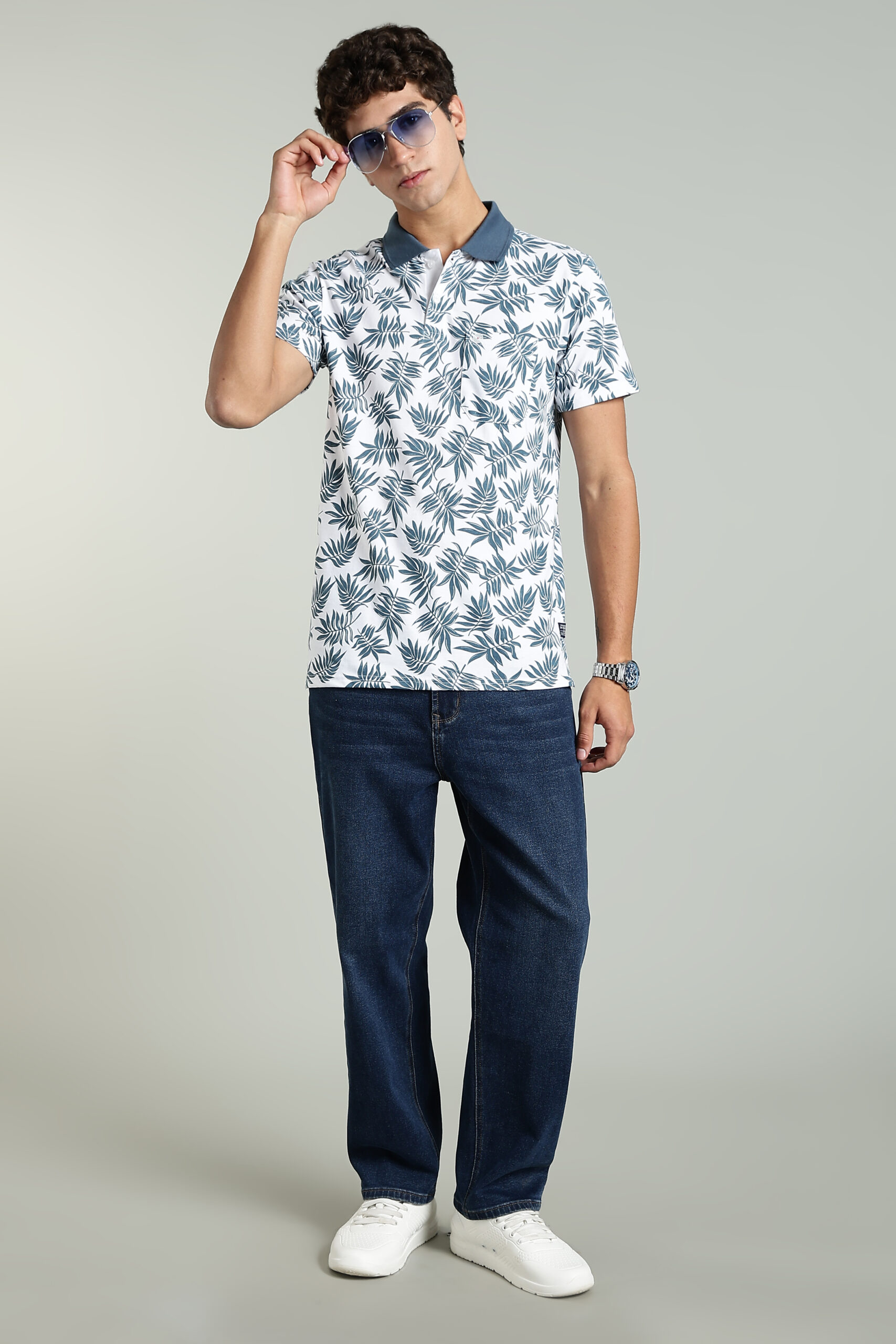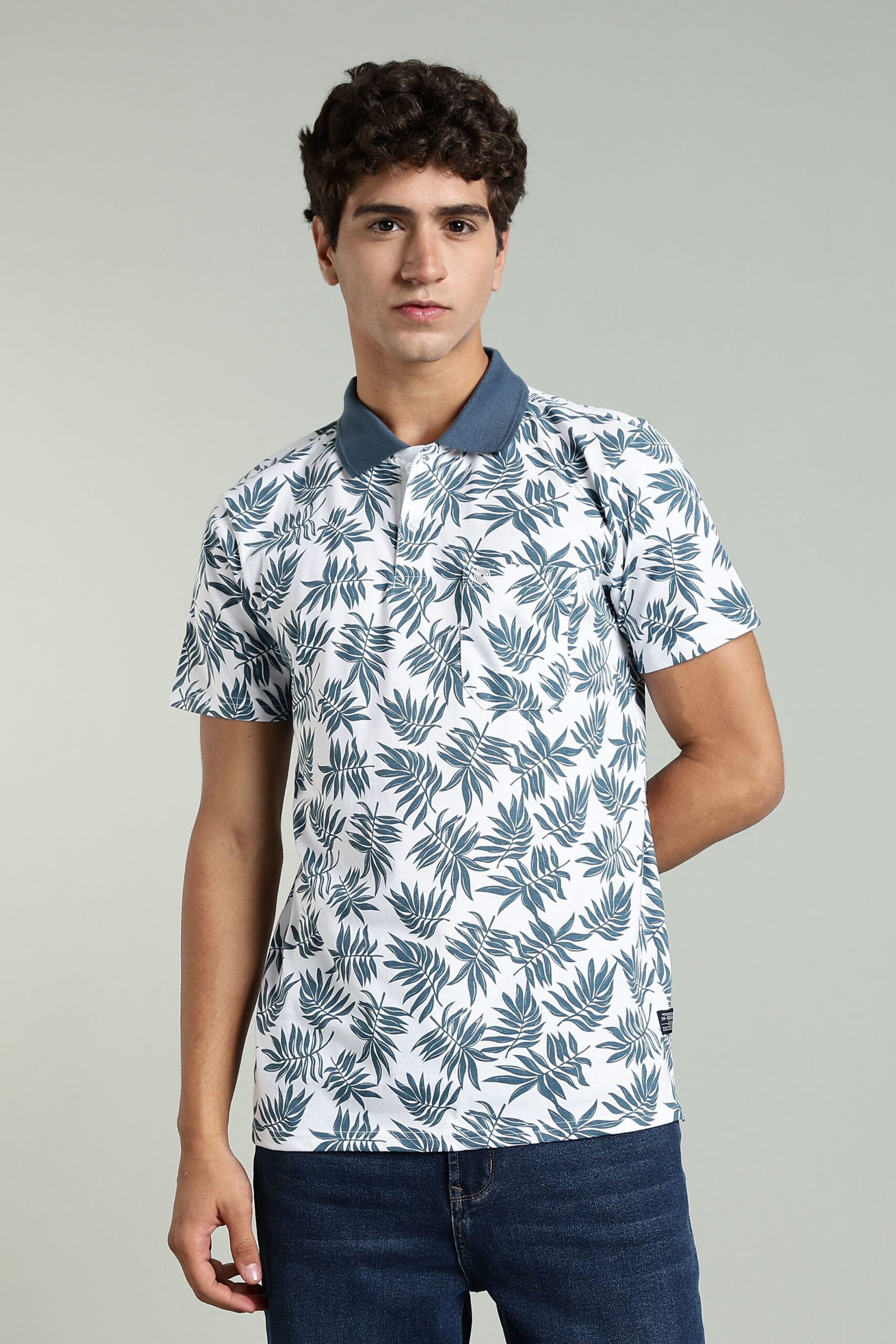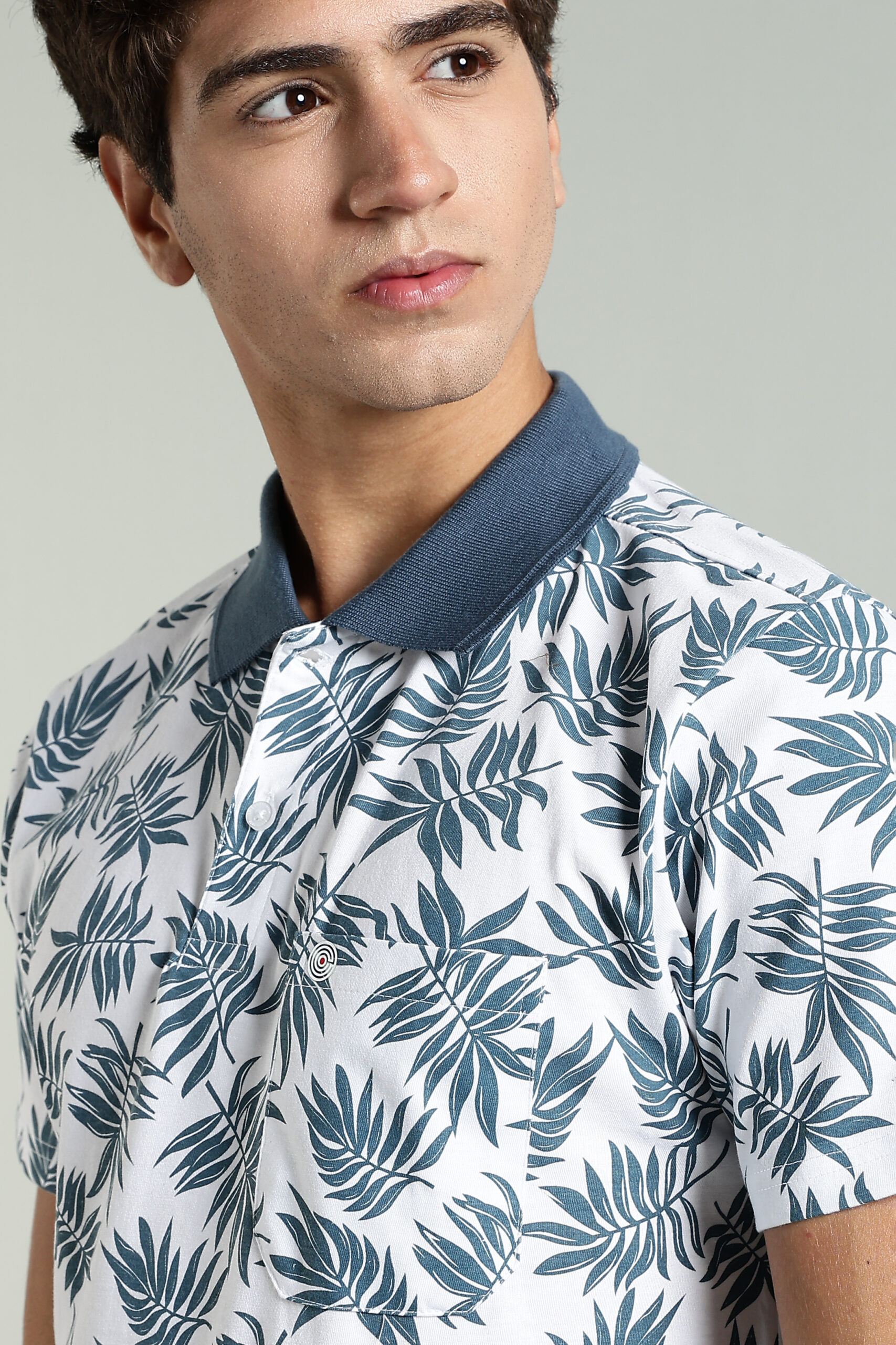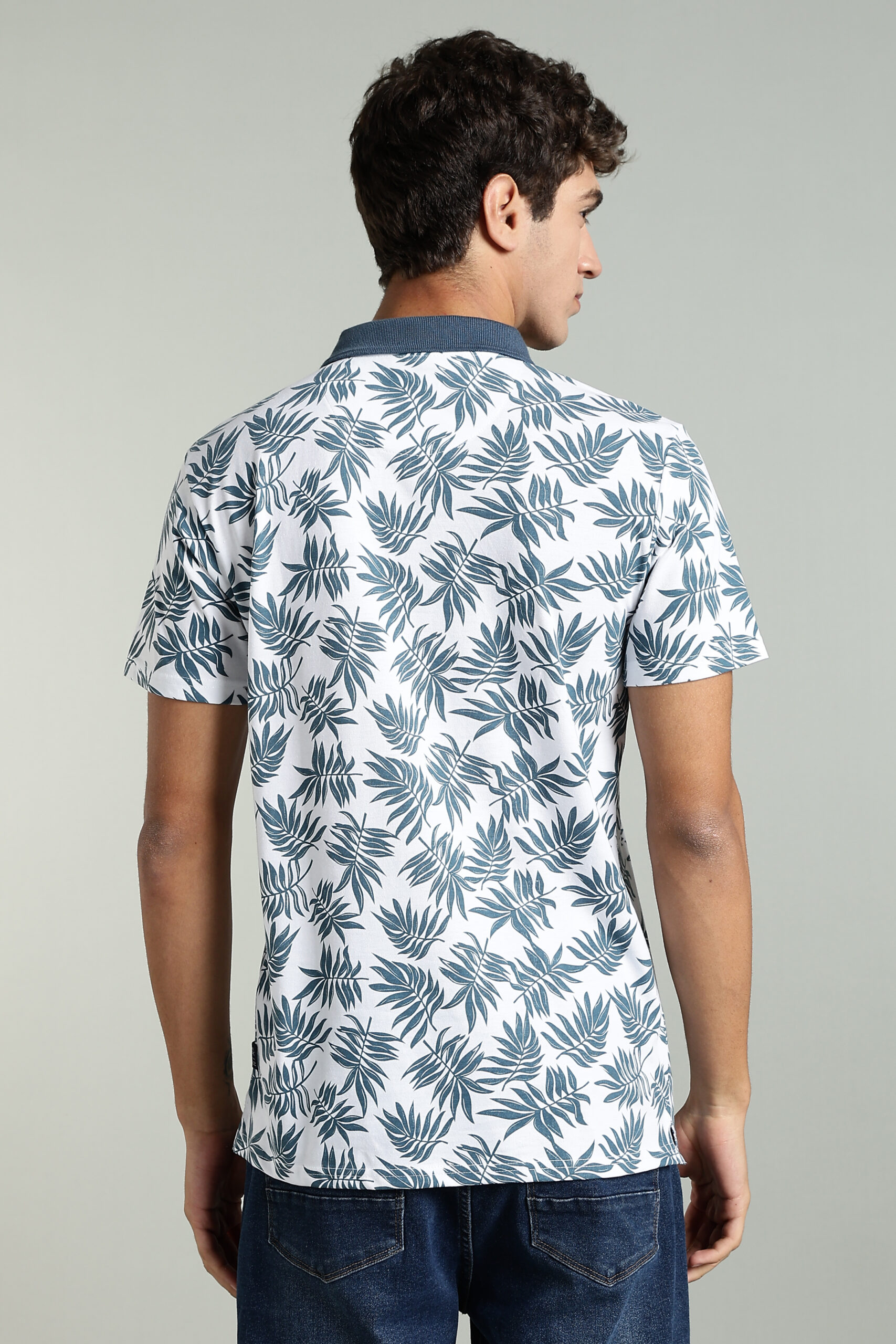 Men’s Cotton-Rich Leaf Print AOP Polo T-Shirt with HD Logo – White & Olive
