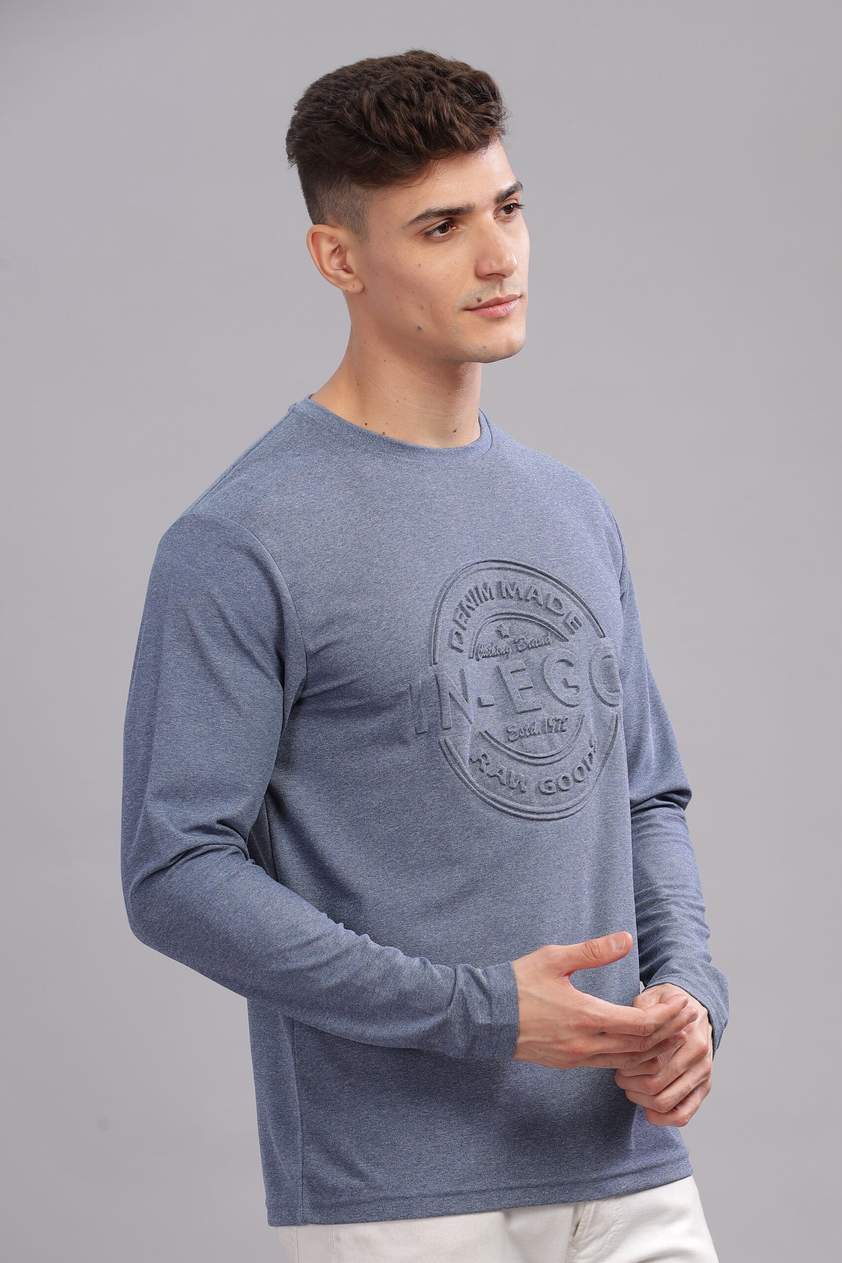 Men’s Melange Long Sleeve Tee with Embossed Chest Print – Multi-Colour Edition