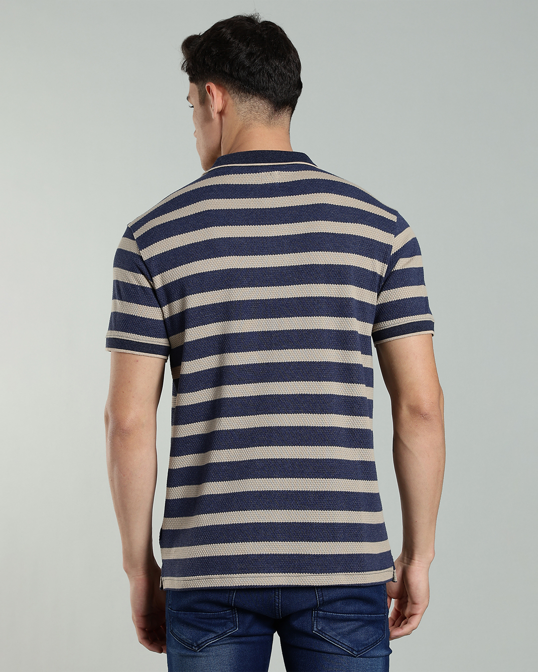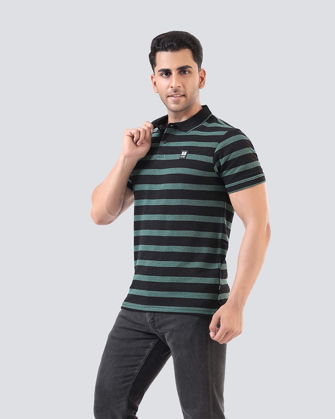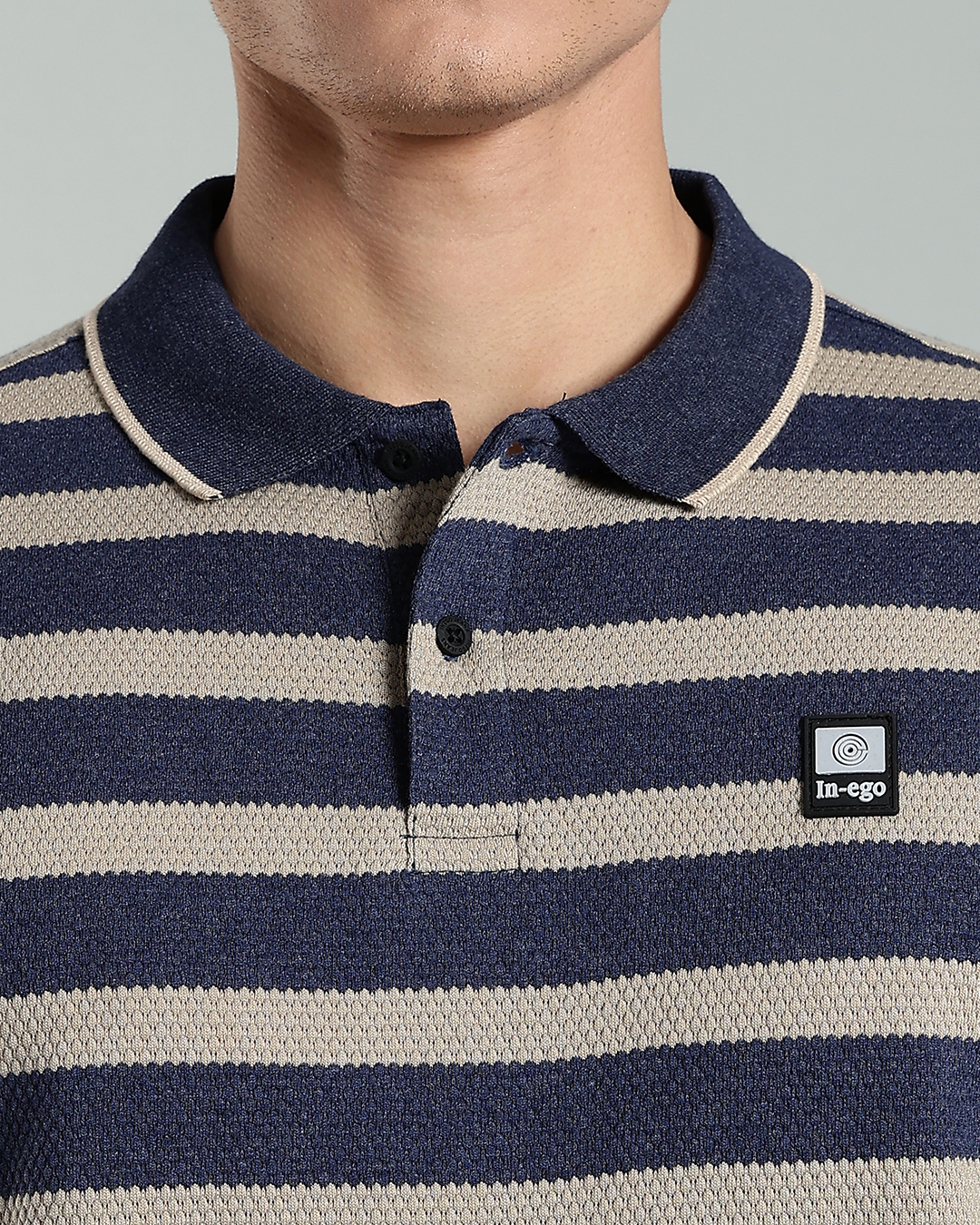 Men’s Popcorn-Texture Striped Polo with Rubber Badge – Dual Colour Options