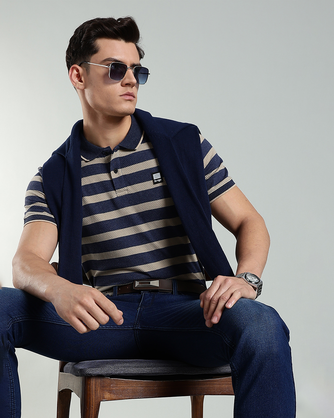 A modern striped polo designed for men who appreciate unique textures and elevated everyday style. ✧