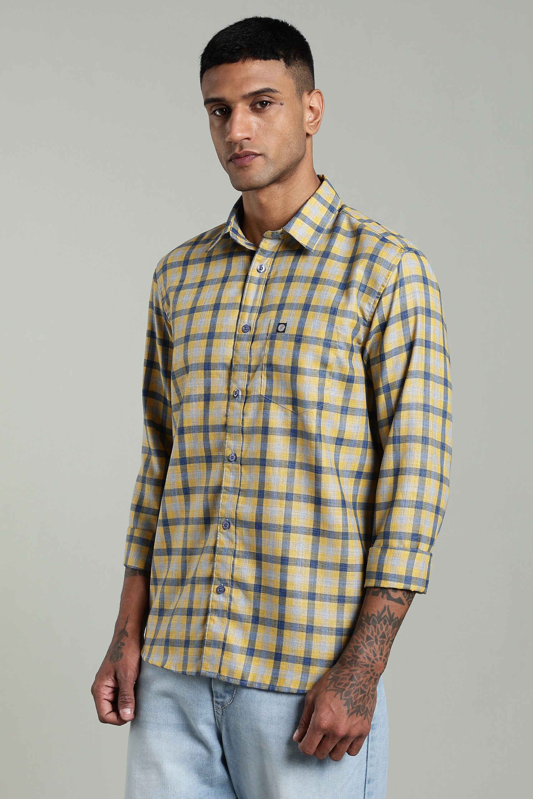 Men’s Premium Linen Checked Long Sleeve Shirt with Logo Detail – Yellow & Blue Checks